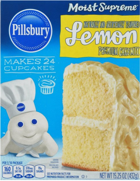 Zutaten: Angereichertes gebleichtes Mehl (Weizenmehl, Niacin, reduziertes Eisen, Thiaminmononitrat, Riboflavin, Folsäure), Zucker, Treibmittel (Backpulver, Calciumphosphat, Natriumaluminiumphosphat), enthält 2 % oder weniger von: Rapsöl, Dextrose, Salz, Natürliches und künstliches Aroma, Maisstärke, Propylenglykolester von Fettsäuren, Monoglyceride, Zellulosegummi, Zellulose, Xanthangummi, Natriumstearoyllactylat, Gelb 5, Zitronensäure und BHT (Antioxidantien).
