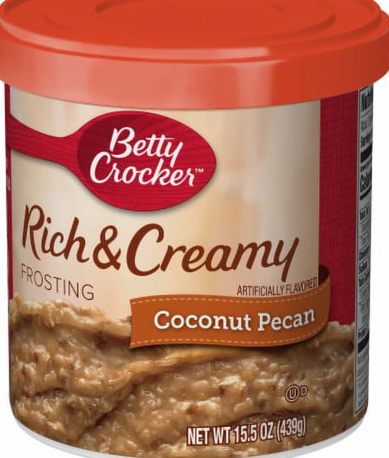 Zutaten: Zucker,Wasser, Palmöl, Kokosnuss, Dextrose, Maltose, Glukose-Fruktose-Sirup, Pecan Stücke. Enthält 2% oder weniger: modifizierte Tapiokastärke, Salz, Trägerstoff E1520, Milch, Emulbator E471, Geliermittel E 440, Backtriebmittel E541, Verdickungsmittel E401, Säuerungsmittel Zitronensäure E330, Stabilisator E509, natürliche und künstliche Aromen, Emulgator E322, Farbstoffe (E102², E110², E129² und E133), Eigelb. Konservierungsstoff E202, E322, E211. *Kann Aufmerksamkeit und Aktivität bei Kindern beeinträchtigen. Allergene:Enthält Kokosnuss, Pecan. ; Milch, Soja und Ei Zutaten.